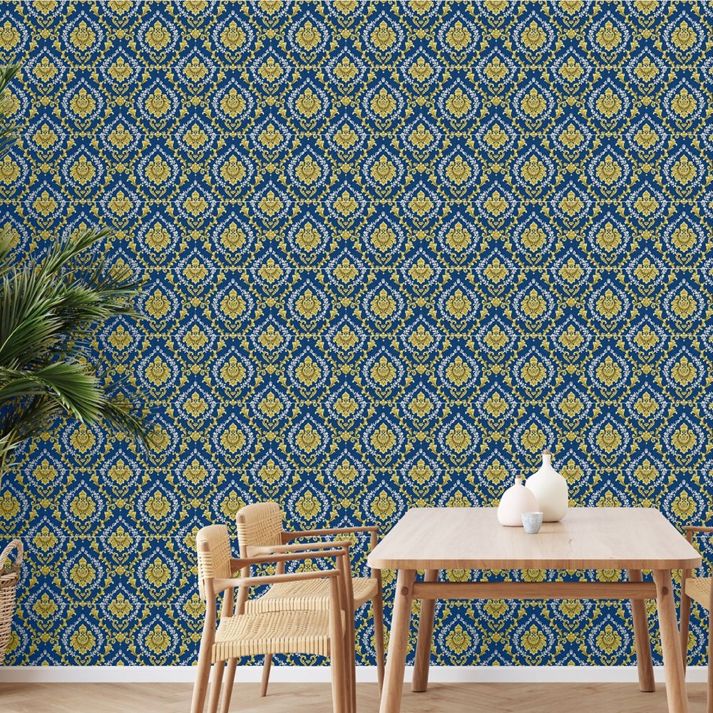 Traditional wallpapers with golden damask designs create exclusive interiors with the traditional aura, light colour artistic designs in a midnight blue background perfectly highlighting the richness of the glorious printing style. It’s a pride to add V Trends décor wallpapers to the interiors.